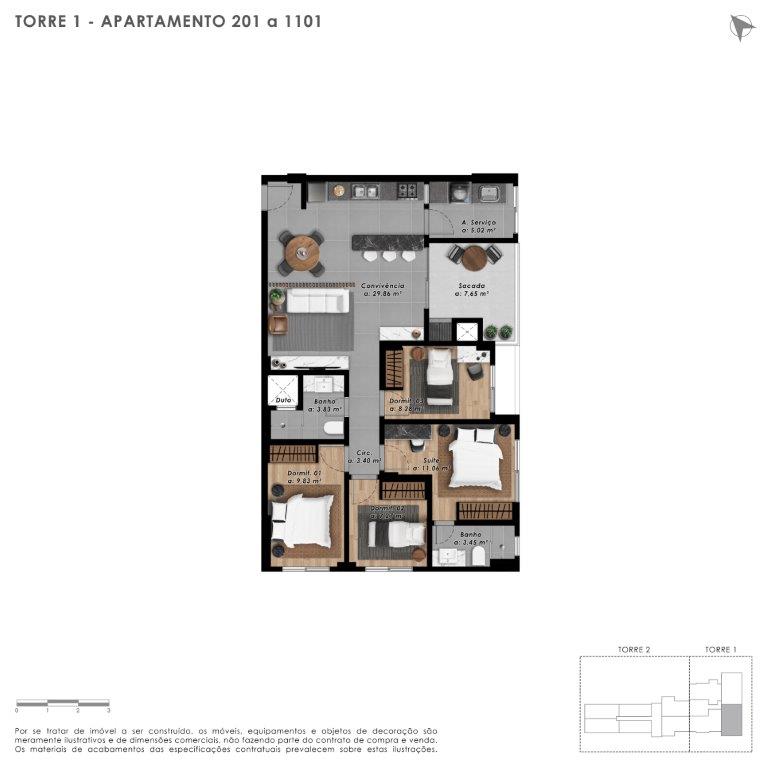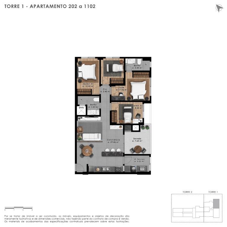 Ampla sacada com churrasqueira a carvão, box de garagem estendido (1 carro médio e 1 carro de pequeno porte), espera p/ split, espera p/ água quente, manta acústica…