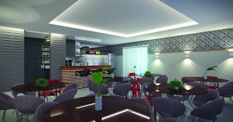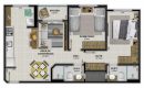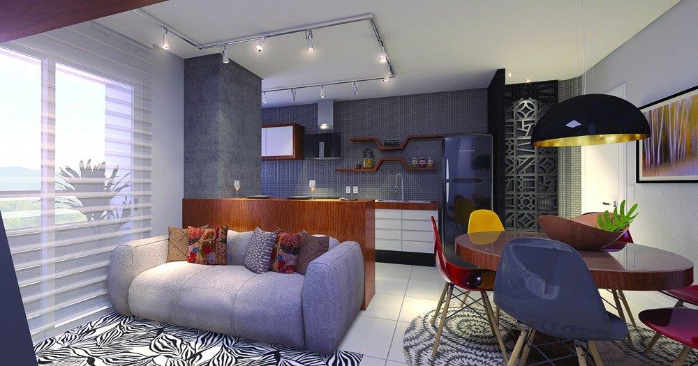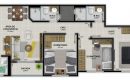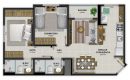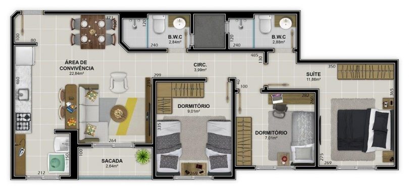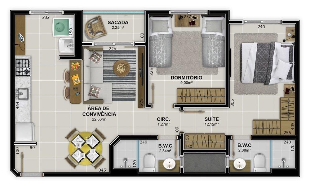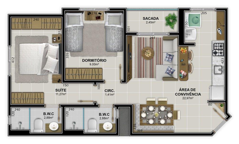 Os apartamentos de 02 ou 03 dormitórios (sendo 01 suíte) possuem também cozinha, área de serviço, sala de estar/jantar, sacada, banheiro social e garagem.