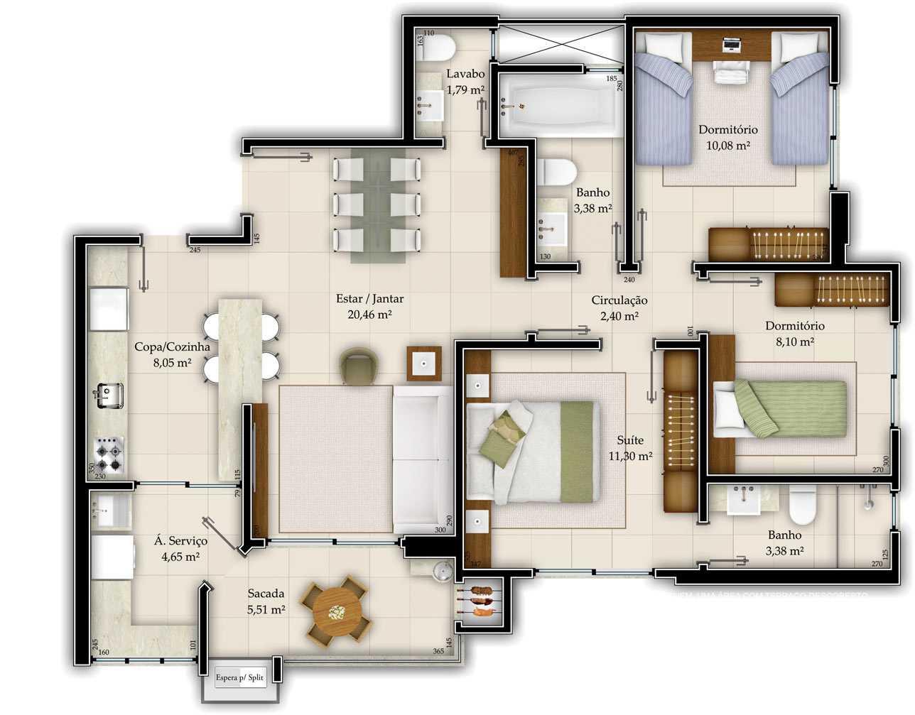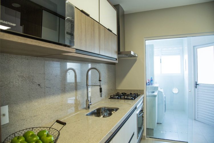 Os apartamentos tem 03 quartos (sendo 01 suíte), sala de estar/jantar, banheiro social, cozinha, área de serviço e sacada com churrasqueira. Há ainda 01 ou 02 vagas de garagem.