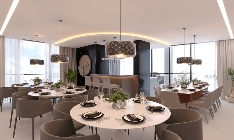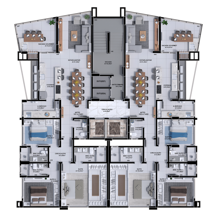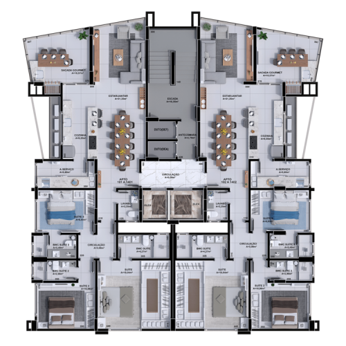 3 suítes, sendo uma com closet, apartamentos com 131m² de área privativa e churrasqueira à carvão.