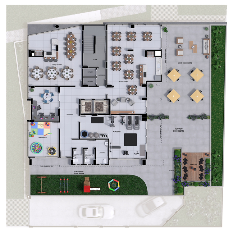 Infraestrutura com Bicicletário, Espaço Gourmet, Hall de Entrada, Salão de Festas, Academia, Brinquedoteca e Playground.